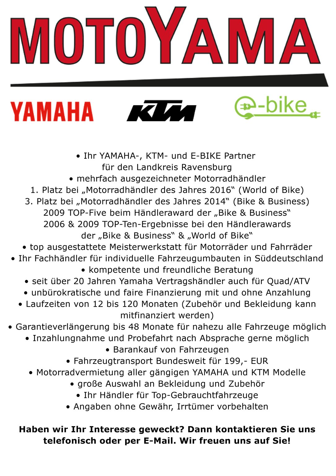 - Ihr kompetenter, freundlicher und zuverlässiger KAWASAKI, YAMAHA & KTM Vertragspartner für den Landkreis Ravensburg sowie die Regionen Oberschwaben und Bodensee